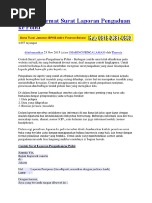 Tidak adanya surat keterangan kecelakaan dari polisi mengakibatkan kami tidak. Laporan dapat disampaikan lewat layanan call cantre polri (110), sms (1717), dan online. Prosedur pencabutan laporan perkara pidana di kepolisian. Mungkin kalau surat keterangan bebas narkoba dari pihak kepolisian bisa hanya dari riwayat kriminal saja. Usahakan rangkap 3, 1 untuk bank, 1 untuk kepolisian, 1 untuk 3.